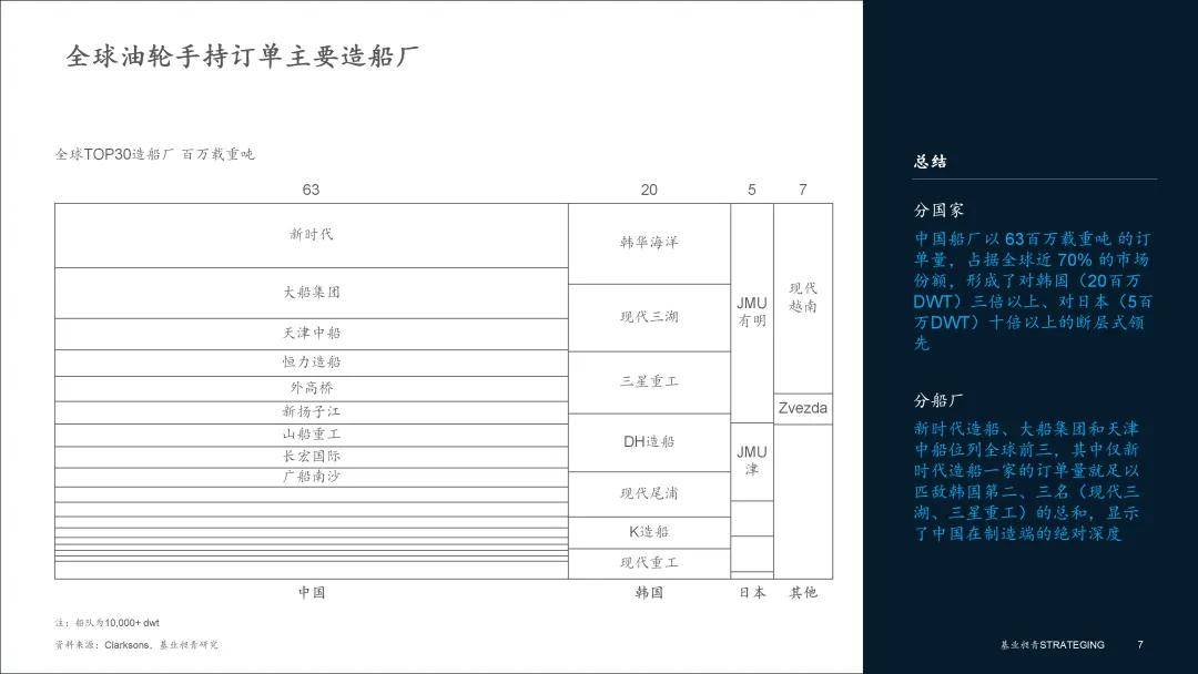 ▪ 国家层面:中国占据绝对主导地位,市场份额近七成。从订单的建造国别来看,全球油轮制造的竞争格局已演变为中国的“一超多强”。在全球约91.6百万载重吨的手持订单中,由中国各大船厂承建的订单总计高达63.3百万载重吨,市场份额接近惊人的70%。这一数字不仅是传统造船强国韩国(20百万载重吨)的三倍有余,更是日本(5.3百万载重吨)的十倍以上。以新时代造船、大船集团、天津中船为代表的中国船厂订单饱满,其单一船厂的订单量就足以媲美一些国家的全国总量。这标志着全球船东,无论是希腊的私人船王还是中东的国家石油公司,都已将中国作为其船队更新换代的首选和核心依赖。
